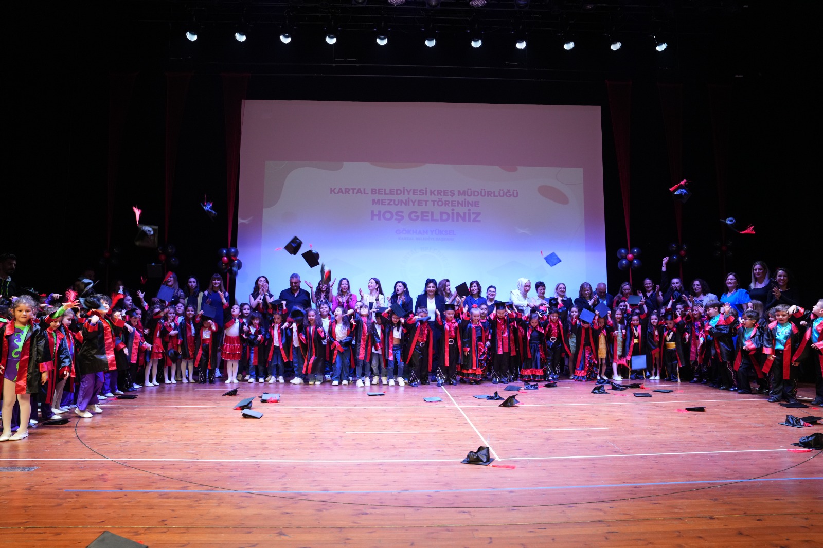 Kartal Belediyesi’ne bağlı 14 kreşin mezuniyet töreni üç bölümde gerçekleştirildi. Her kreşin ayrı ayrı sahne aldığı gösteriler, mezuniyet törenine renk kattı. Öğrencilerin kep atma töreni, veliler ve davetlilerden büyük alkış aldı.Kep atma anı, hem çocuklar hem de veliler için unutulmaz bir anı olarak hafızalarda yer etti. Veliler, çocuklarının mezuniyet sevincine ortak oldu ve bu özel günü coşku içinde kutladı. Törenin sonunda, öğrenciler ve veliler sahnede bol bol fotoğraf çektirerek bu anlamlı günü ölümsüzleştirdi.Mezuniyet töreni, çocukların hayatlarında yeni bir dönemin başlangıcını simgelerken, veliler ve öğretmenler için de gurur verici bir anı oldu.