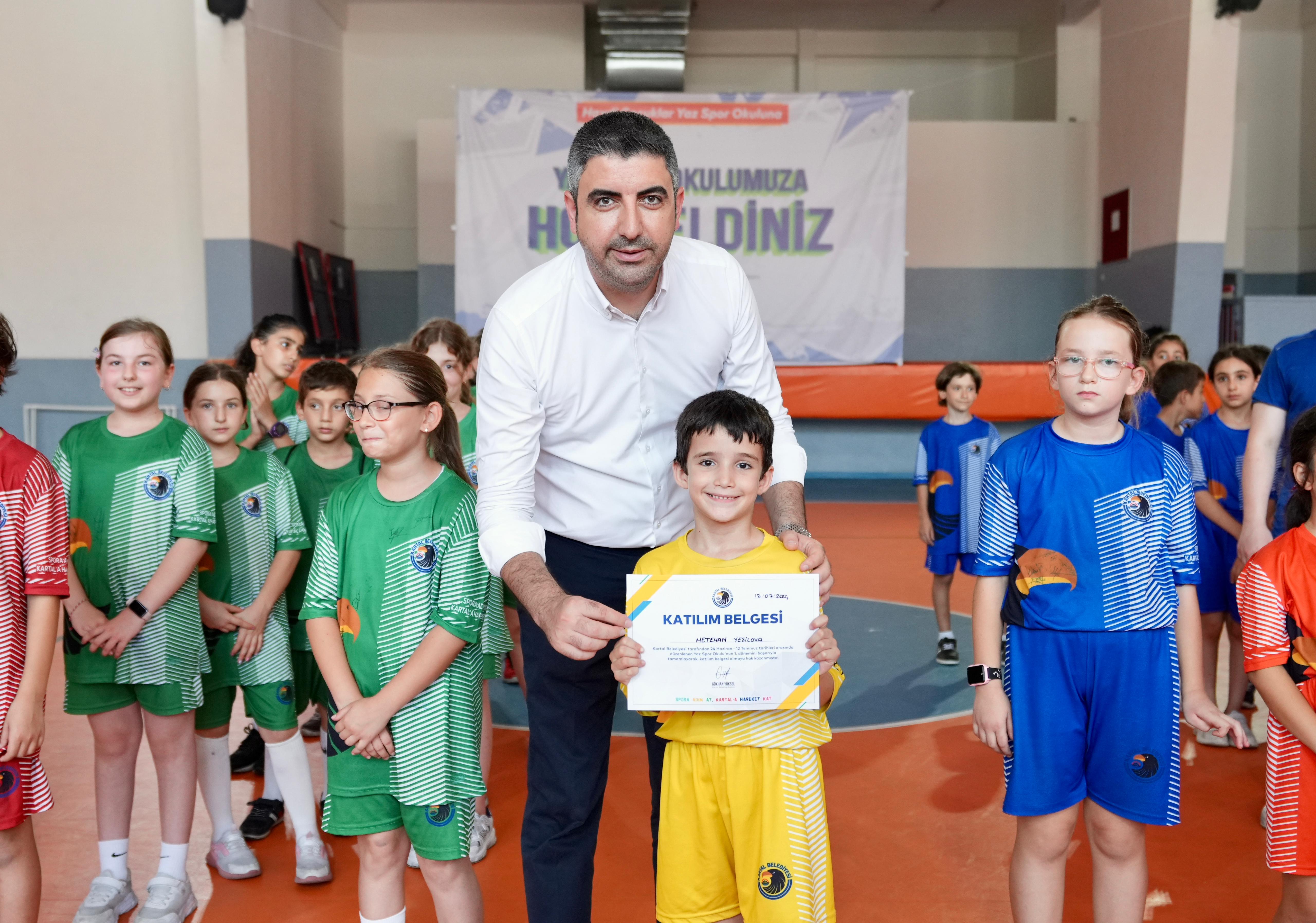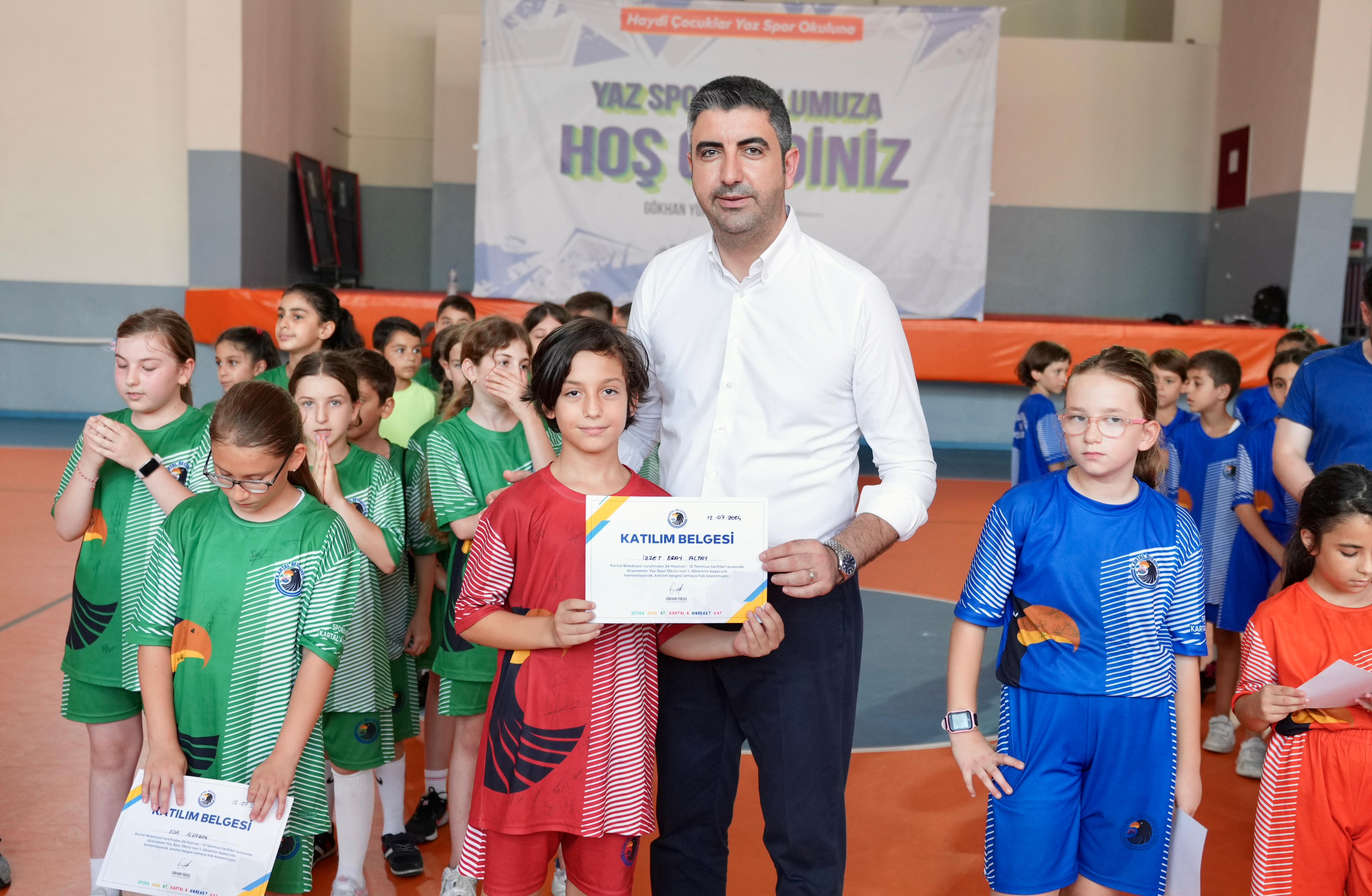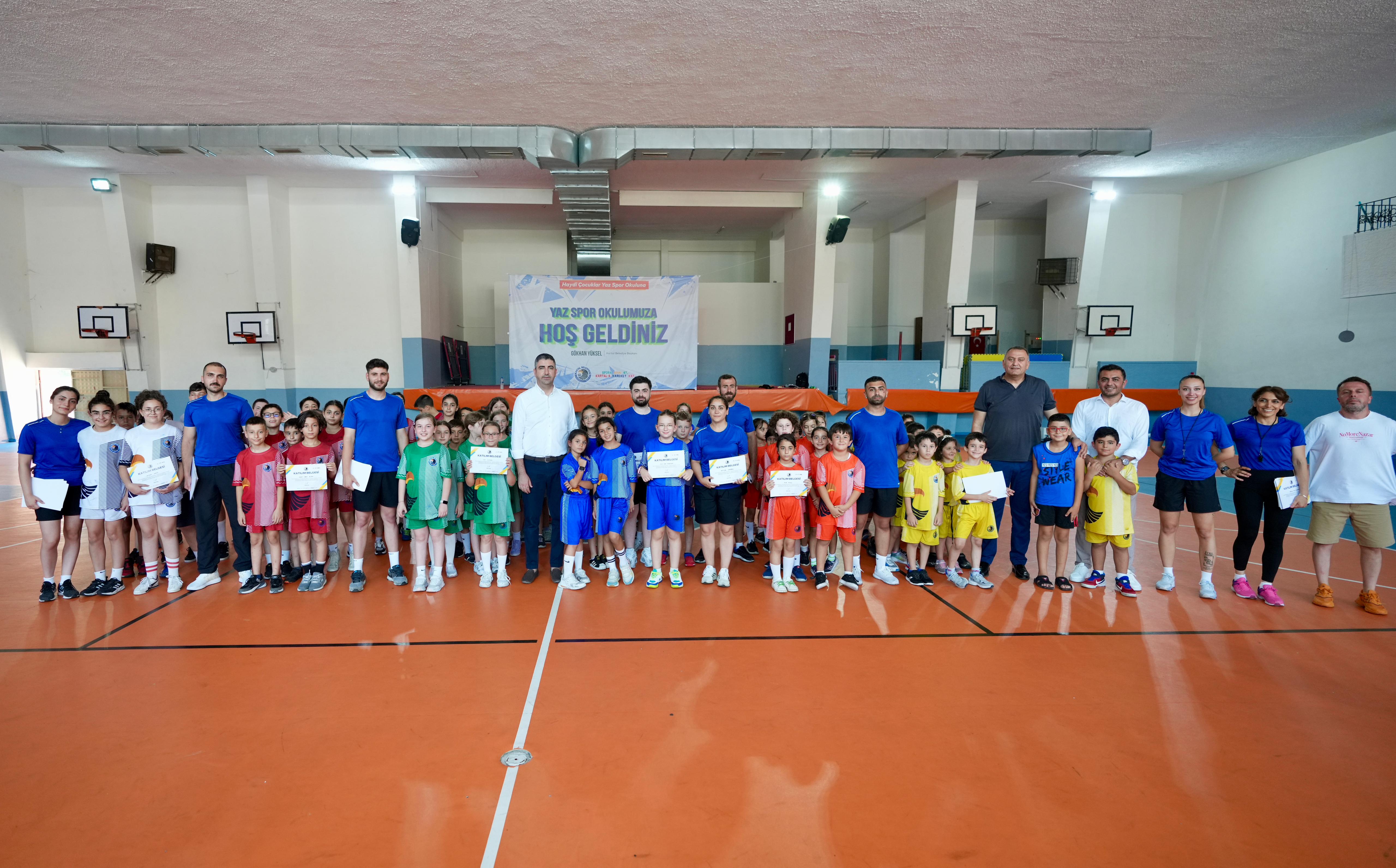 Kartal Belediyesi tarafından düzenlenen ve ilçedeki çocukların yaz tatilinde spor yapmalarına olanak tanıyan ‘Ücretsiz Yaz Spor Okulu’ bu yılın ilk mezunlarını verdi.Mezuniyet töreninde kartal Belediye Başkanı Gökhan Yüksel, genç sporculara sertifikalarını takdim ederek, Kartal’da çocuklar ve gençler için sanat, spor ve eğitime yönelik çalışmalara öncelik verdiklerinin altını çizdi. Yaz Spor Okulu’nun üç haftalık sürecinin ardından ilk dönemi tamamlanan spor okuluna katılım yoğun oldu. Kartallı veliler çocuklarını belediyenin ücretsiz spor okullarına kaydederek basketbol, voleybol, hentbol, futbol, jimnastik, tenis, masa tenisi, dans, satranç, akıl oyunları ve savunma sporları gibi birçok daldan faydalanma fırsatı yakaladı.6 farklı yaş gruplarındaki toplam 150 öğrenciye 12 branşta eğitim sunan yaz spor okulu ilk dönem sonu mezuniyet töreni, Kartal Şehit Öğretmen Hüseyin Ağırman Mesleki ve Teknik Anadolu Lisesi’nde gerçekleşti. “Sanat ve Spor En Büyük Çalışma Alanımız”