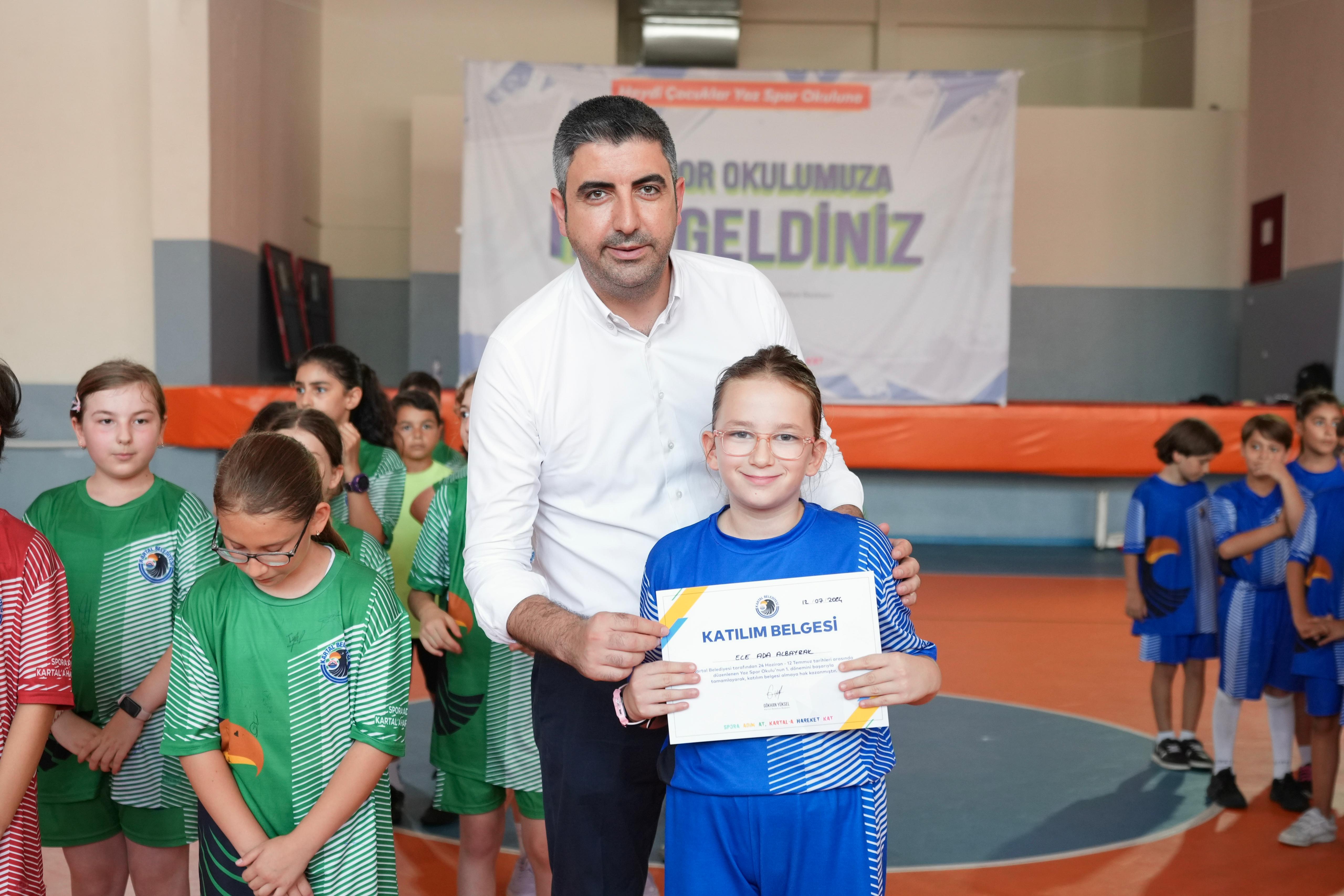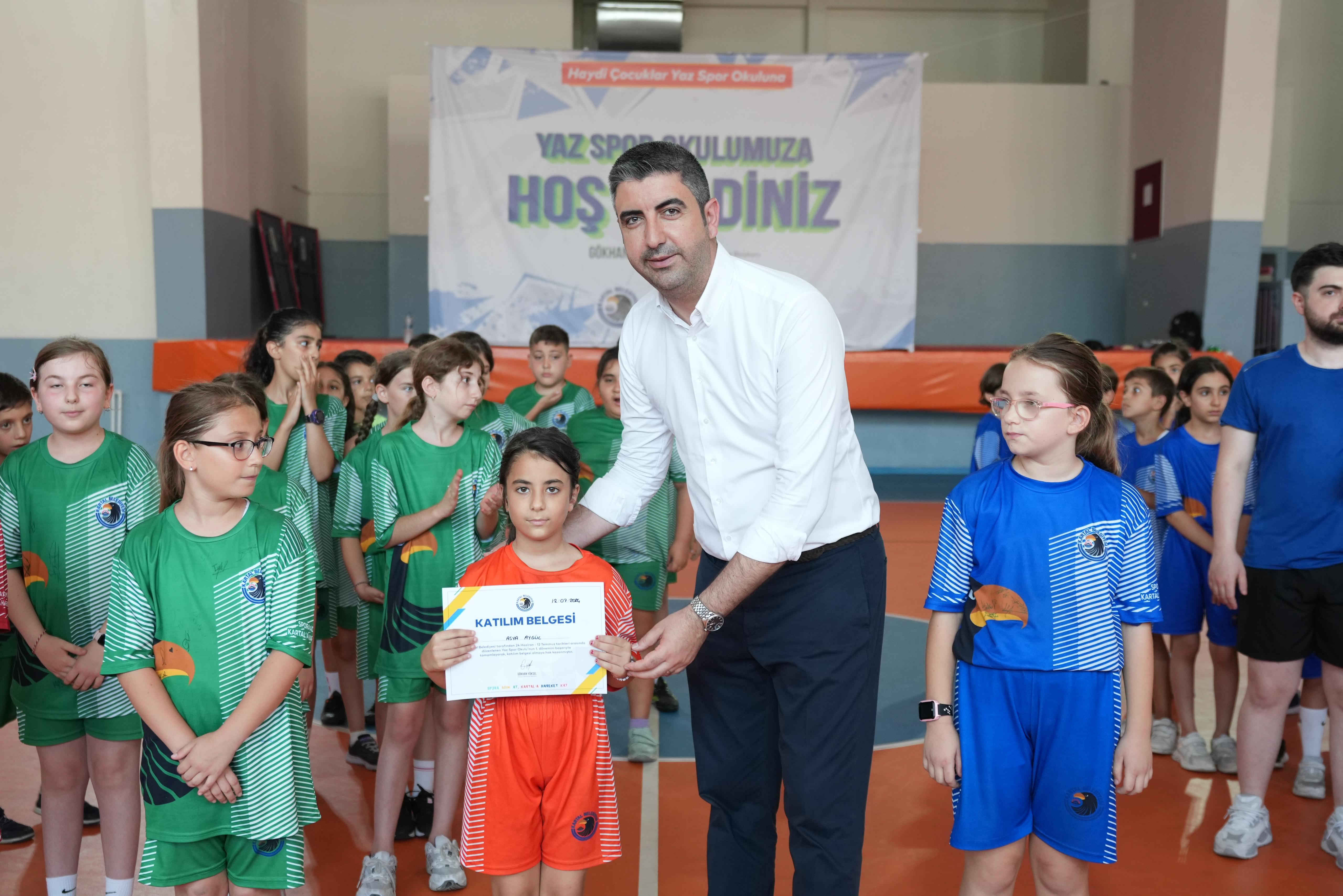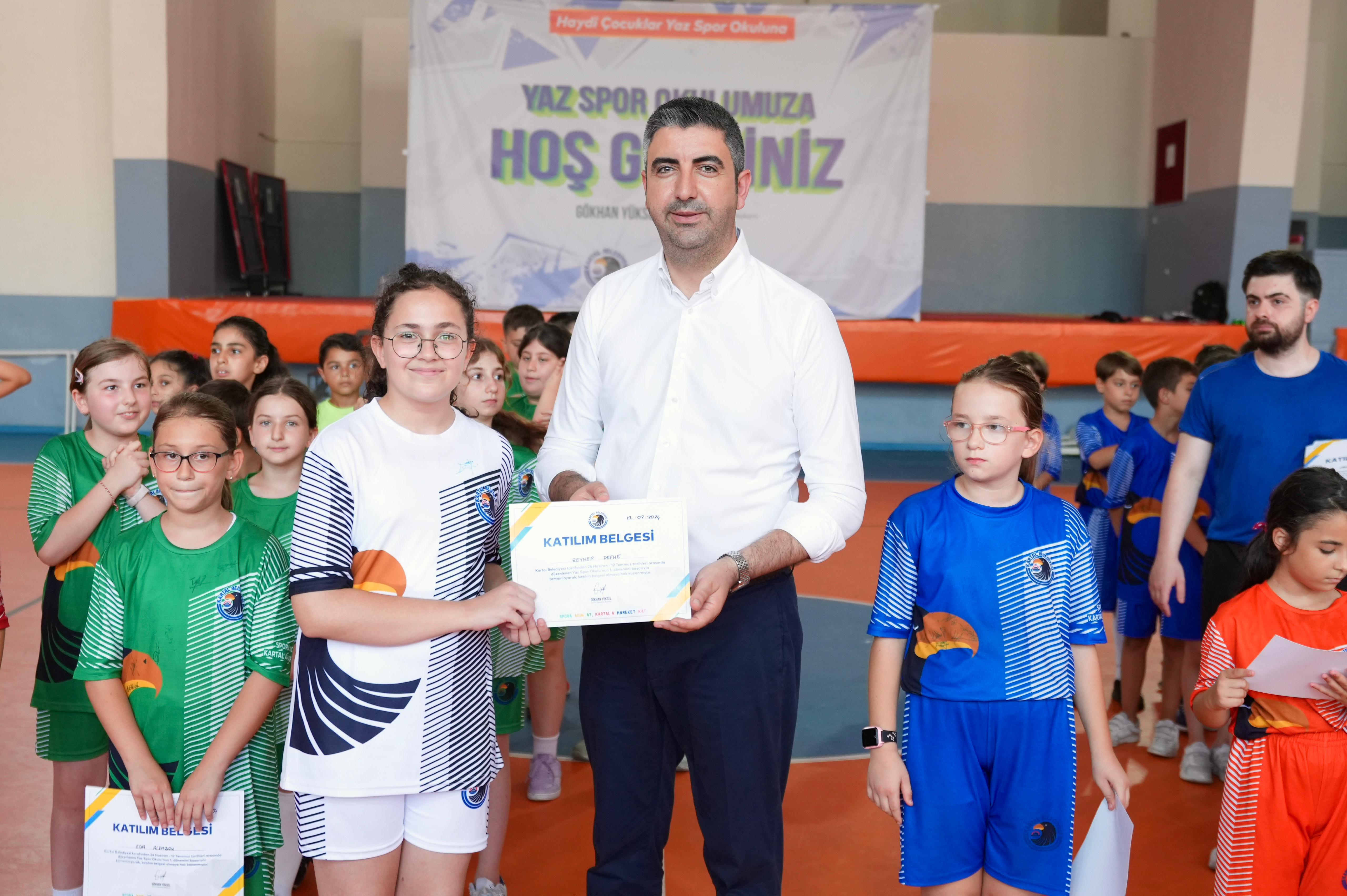 Genç sporculara katılım belgelerini takdim eden Kartal Belediye Başkanı Gökhan Yüksel, “Yaklaşık üç hafta birbirinden güzel spor dallarıyla çocuklarımızı buluşturduk.Gösterdikleri özveri için çocuklarımıza ve ailelerine teşekkür ediyorum. Burada unutamayacakları anılar biriktirdiler ve yeni arkadaşlıklar kurdular buna vesile olduğumuz için ekip olarak çok mutluyuz. Kartal Belediyesi olarak yazılıma, eğitime, sanata ve spora ne kadar önem verdiğimizi ortaya koyduğumuzu çalışmalarımızla gösteriyoruz. Bugün burada olan tüm ailelere ve çocuklara teşekkür ediyorum.” ifadelerini kullandı. Yaz Boyu 12 Branşta Eğitim