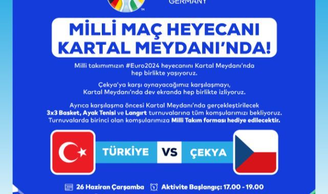Kartal Belediyesi, 2024 Avrupa Futbol Şampiyonası’nda Türkiye A Milli Futbol Takımı’nın Çekya ile oynayacağı maçı, kartal Meydanı’na kuracağı dev ekrandan yayınlayacak.Kartallı vatandaşlar, Türk Milli Futbol Takımı’nın UEFA EURO 2024’teki Çekya ile oynayacağı son grup maçını, Kartal Meydanı’na kurulacak dev ekrandan takip edebilecek.Ayrıca karşılaşma öncesi yine Kartal Meydanı’nda gerçekleştirilecek 3x3 basket, ayak tenisi ve langırt turnuvaları ise hem yarışmacıları hem de taraftarları milli maça hazırlayacak heyecanlı etkinlikler arasında yerini alacak. Turnuvada birincilik elde eden yarışmacılara ise milli takım forması hediye edilecek.Türkiye’nin 26 Haziran Çarşamba akşamı saat 22.00’de Çekya ile çıkacağı grubun son maçını izlemeye tüm Kartallılar’ı davet eden Başkan Gökhan Yüksel, “Türk Milli Futbol Takımımızın, Çarşamba akşamı Çekya ile galibiyet mücadelesi vereceği maçta, tüm komşularımızı milli heyecana ortak olmaya davet ediyorum.Haydi Kartal, galibiyet parolası ile sahaya çıkacak milli takımımızı desteklemek için Çarşamba günü saat 22.00’de Kartal Meydanı’nda buluşalım.” ifadelerini kullandı.Tarih: 26 Haziran Çarşamba