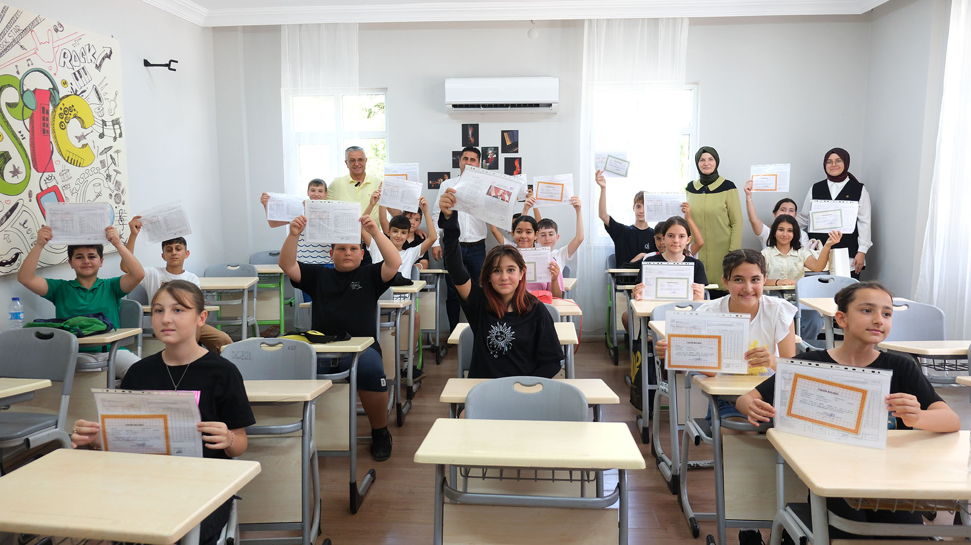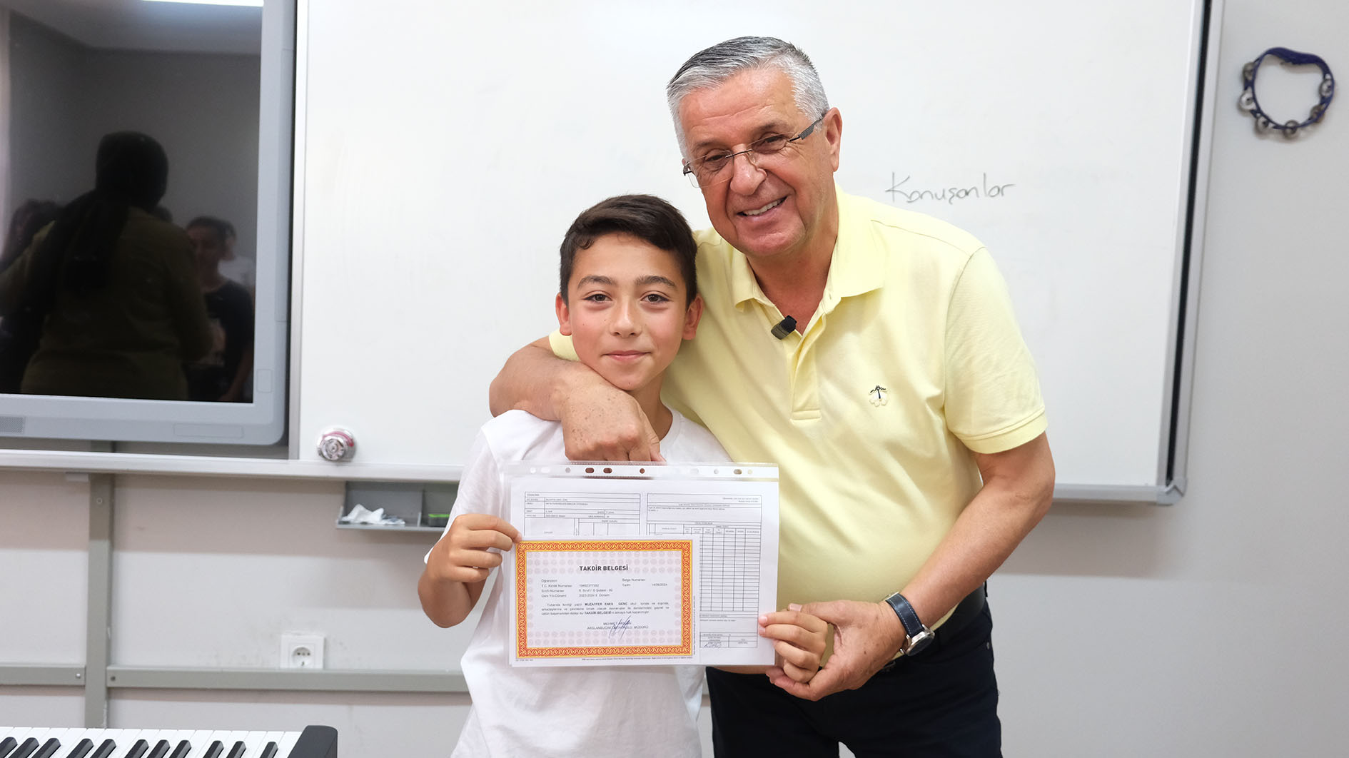 Kemer Belediye Başkanı Necati Topaloğlu, 2023-2024 eğitim ve öğretim yılının sona ermesi nedeniyle Arslanbucak Ortaokulu'nda düzenlenen karne törenine katıldı.