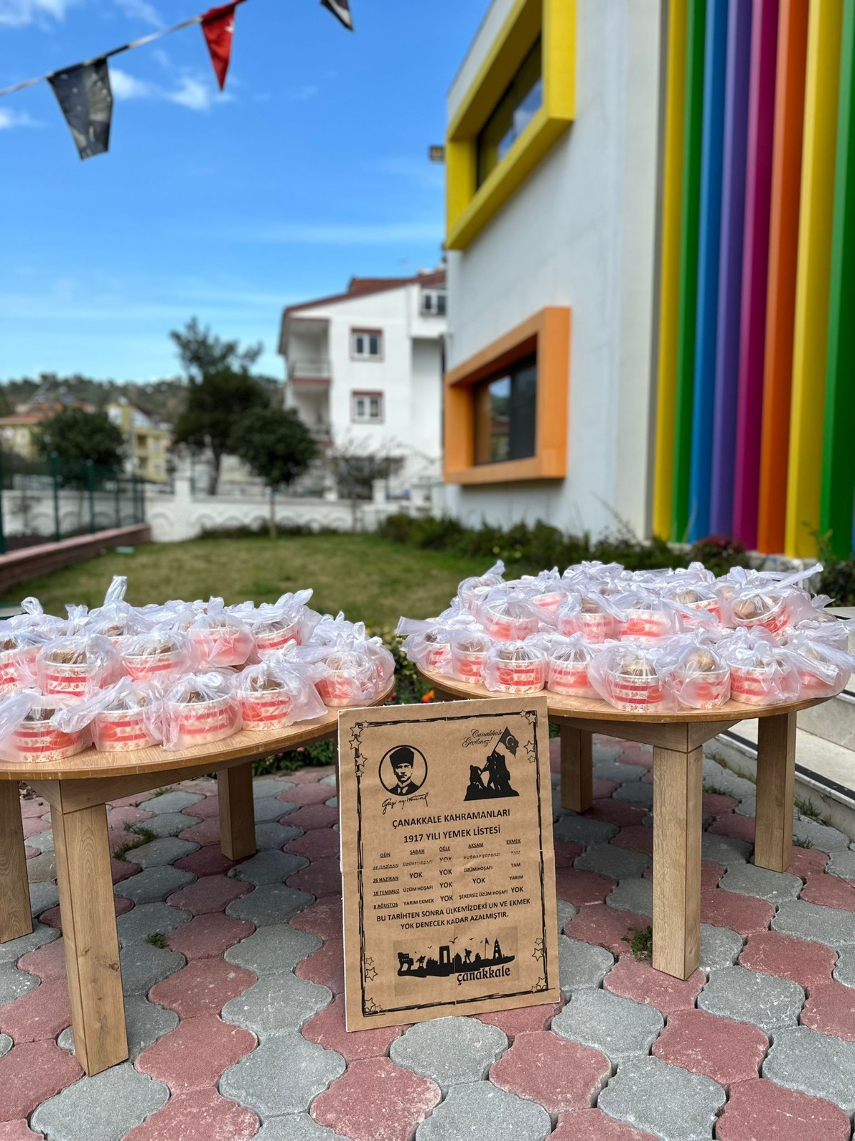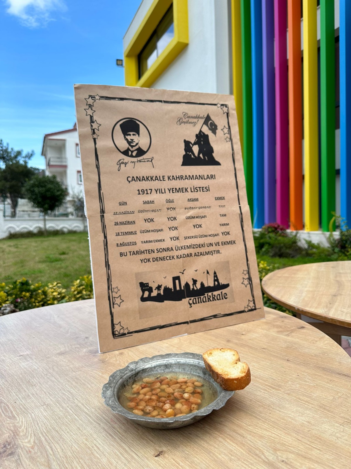Kemer Belediyesi Ülker – Orduvar Akman Kreş ve Gündüz Bakımevi öğretmenleri ve öğrencileri, 18 Mart Çanakkale Deniz Zaferi’nin 109’ncu yıl dönümü dolayısıyla etkinlik düzenledi. Çanakkale ile ilgili görseller ve maketlerin hazırlandığı okulda, minik öğrenciler Çanakkale Savaşı’nda kahraman Türk askerinin yediği hoşaf ve ekmekten yedi. Okul Müdürü Oya Aslantaş, yaptığı açıklamada, “Çocuklarımıza aziz Türk milletinin tarihini anlatmak ve tarihimizde önemli bir yere sahip Çanakkale Deniz Zaferi’ni anlatmak için bir etkinlik yaptık.Okulumuzun bazı yerlerinde ve sınıflarda Çanakkale Savaşı’nı anlatan maketler yaparak yazılar yazdık ve çocuklarımızı bilgilendirdik.1917’deki yemek listesinde yer alan hoşaf ve bir dilim ekmek yaparak çocuklarımıza dağıttık. Çocuklarımız hem eğlendi hem de tarihimizi öğrenmiş oldu.” dedi.