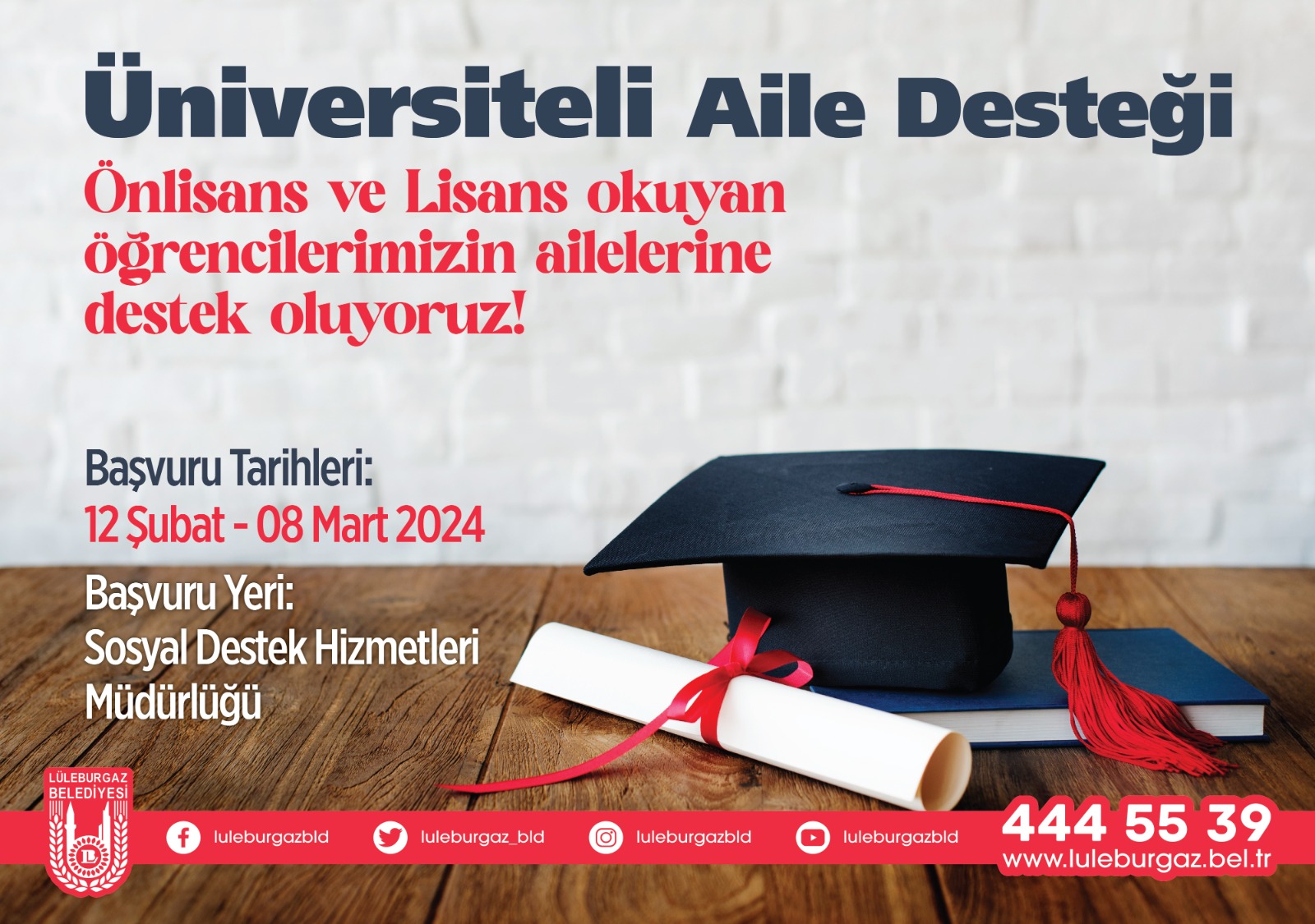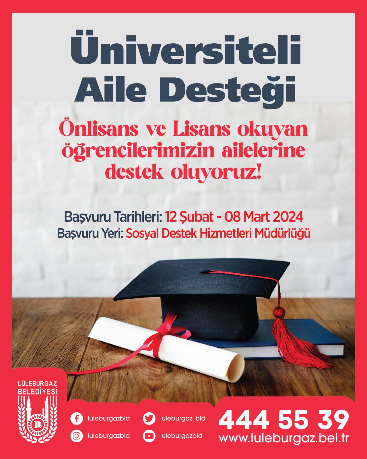 Lüleburgaz Belediyesi’nin ‘ Başarı sizden destek bizden’ sloganıyla 2021 yılında hayata geçirdiği Üniversiteli Aile Desteği yeni dönem başvuruları başlıyor.Ön lisans ve lisans programında öğrenim gören öğrenciler, istenilen belgelerle birlikte 12 Şubat ile 8 Mart tarihleri arasında Lüleburgaz Yıldızları Sanat Akademisi’nde yer alan Sosyal Destek Hizmetleri Müdürlüğü’ne başvurabilecek.BAŞVURU ŞARTLARIBaşvurular öğrenci velisi tarafından Sosyal Destek Hizmetleri Müdürlüğü’ne yapılabiliyor.Başvuru şartları arasında, öğrencinin velisinin Lüleburgaz’da ikamet etmesi, aktif ön lisans veya lisans öğrencisi olması, normal öğrenim süresinin içinde eğitimine devam ediyor olması (yeni kayıt yaptıranlar dahil), devlet üniversitesinde okuyor olmak veya Vakıf /Özel üniversitede yüzde yüz burslu okuyor olması, örgün öğretim görmesi, ara sınıf ve son sınıf öğrencileri için yılsonu başarı notunun en az 100 üzerinden 53 ya da 4 üzerinden 2,00 olması, gelir durumu açısından maddi desteğe ihtiyacı olması (Hane içinde kişi başına düşen ortalama aylık gelir tutarı, asgari ücretin aylık net tutarının 1/3’ünden fazla olanlar alamaz) yer alıyor.BAŞVURUDA İSTENİLEN BELGELERÖğrenci velisinden istenilen evraklar