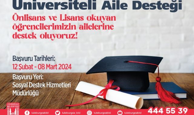 Lüleburgaz Belediyesi’nin Üniversiteli Aile Desteği Programı başvuruları 12 Şubat’ta başlıyor.Ön lisans ve lisans programında öğrenim gören öğrenciler istenilen belgelerle birlikte 12 Şubat ile 8 Mart tarihleri arasında Lüleburgaz Yıldızları Sanat Akademisi’nde yer alan Sosyal Destek Hizmetleri Müdürlüğü’ne başvurabilecek.