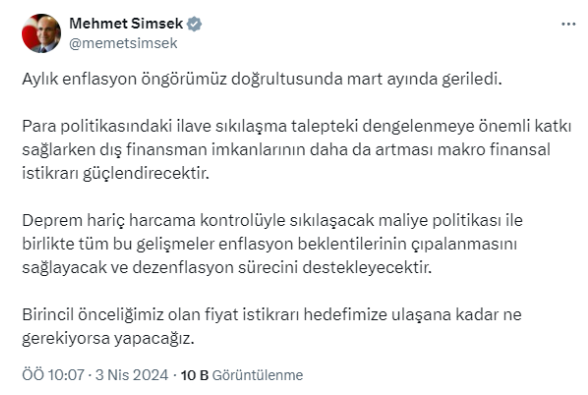 Enflasyon mart ayında yüzde 3,16 artarak yıllık bazda yüzde 68,50 olurken Hazine ve Maliye Bakanı Mehmet Şimşek'ten konuyla ilgili ilk değerlendirme geldi.