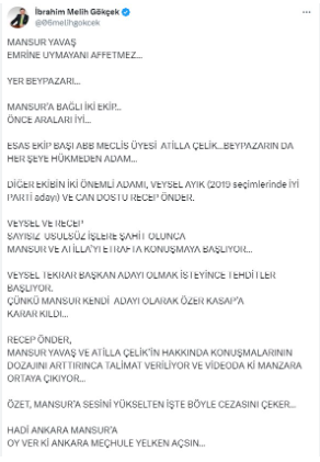 Eski Ankara Büyükşehir Belediye Başkanı Melih Gökçek, İYİ Parti Beypazarı İlçe Başkanı Recep Önder'in ABB Meclis Üyesi Atilla Çelik'in yakınları tarafından darbedildiği görüntüleri paylaştı.Videoda, yerde sürüklenen Önder'in tekme tokat dövüldüğü, Önder'in Ankara Büyükşehir Belediye Başkanı Mansur Yavaş ve Atilla Çellik'ten özür dilediği görüldü.Eski Ankara Büyükşehir Belediye Başkanı Melih Gökçek, İYİ Parti Beypazarı İlçe Başkanı Recep Önder'in ABB Meclis Üyesi Atilla Çelik'in yakınları tarafından tekme tokat dövüldüğü görüntüleri paylaştı.Eski Ankara Büyükşehir Belediye Başkanı Melih Gökçek, sosyal medya hesabından dikkat çeken bir paylaşım yaptı. Melih Gökçek,İYİ Parti Beypazarı İlçe Başkanı Recep Önder'in ABB Meclis Üyesi Atilla Çelik'in yakınları tarafından darbedildiği görüntüleri paylaştı.Videoda, Önder'in yüzüne sert darbeler aldığı, yerde sürüklenerek tekme tokat dövüldüğü görüldü. Saldırgan şahıslar, Recep Önder'e tehditle Ankara Büyükşehir Belediye Başkanı Mansur Yavaş ve Atilla Çelik'ten özür diletti.Şahsın, "Konuş lan. Bak öldürürüm, boynunu keserim. Özür dile." şeklinde tehdit savurduğu anlar videoda yer aldı.Gökçek paylaşımında şu ifadelere yer verdi: "Mansur Yavaş. Emrine uymayanı affetmez. Yer Beypazarı. Mansur'a bağlı iki ekip. Önce araları iyi. Esas ekip başı ABB Meclis Üyesi Atilla Çelik. Beypazarı'nda her şeye hükmeden adam.Diğer ekibin iki önemli adamı, Veysel Ayık (2019 seçimlerinde İYİ Parti adayı) ve can dostu Recep Önder.Veysel ve Recep sayısız usulsüz işlere şahit olunca Mansur ve Atilla'yı etrafta konuşmaya başlıyor. Veysel tekrar başkan adayı olmak isteyince tehditler başlıyor. Çünkü Mansur kendi adayı olarak Özer Kasap'a karar kıldı.Recep Önder, Mansur Yavaş ve Atilla Çelik'in hakkında konuşmalarının dozajını artırınca talimat veriliyor ve videodaki manzara ortaya çıkıyor. Özet, Mansur'a sesini yükselten işte böyle cezasını çeker. Hadi Ankara Mansur'a oy ver ki Ankara meçhule yelken açsın.Bu arada bu videoyu seyredecek olan Meral Akşener şu anda Beypazarı'na İYİ Parti İlçe Başkanı yaptığı Recep Önder'e yapılanları görünce tavrı ne olacak, gerçekten çok merak ediyorum. Bu konuyla ilgili pek çok tweetim olacak.Videoyu seyrettikten sonra mutlaka düşüncelerinizi bu tweetin altına yazın ki uyuyanlar da uyansın. Videodaki galiz küfürleri kesemedim. Öyle bir tekniğim yok. Özellikle tüm bayanlardan özür diliyorum."