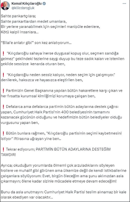 Eski CHP Genel Başkanı Kemal Kılıçdaroğlu, "Seni sırtından hançerleyenlere oy yok" ibaresi yer alan ve "Kılıçdaroğlu Gönüllüleri" imzasıyla asılan pankartlarla ilgili açıklama yaptı. "Kılıçdaroğlu partisinin seçimi kaybetmesini istiyor" iftirasına uğradığını belirten Kılıçdaroğlu, "Partimin bütün adaylarına desteğim tamdır" mesajı verdi.Yerel seçimler için geri sayım devam ederken "Kılıçdaroğlu Gönüllüleri" imzasıyla asılan pankartlar büyük tartışma yarattı. "Seni sırtından hançerleyenlere oy yok!!" ibaresi yer aldığı pankartlar sonrası gözlerin çevrildiği eski CHP Genel Başkanı Kemal Kılıçdaroğlu, sosyal medya hesabından bir açıklama yaptı."DESTEĞİM TAMDIR" MESAJIAçıklamasına "Sahte pankartçılara; Sahte pankartlardan medet umanlara, Bir yerlere yaranabilmek için seçimleri manipüle edenlere, Kötü kalpli insanlara… 'Bilal'e anlatır gibi' son kez anlatıyorum…" diye başlayan Kılıçdaroğlu, "Kılıçdaroğlu partisinin seçimi kaybetmesini istiyor" iftirasına uğradığını belirttiği mesajında büyük harflerle "PARTİMİN BÜTÜN ADAYLARINA DESTEĞİM TAMDIR!" dedi.Kılıçdaroğlu'nun sosyal medya hesabından yaptığı açıklama şöyle:"Sahte pankartçılara;Sahte pankartlardan medet umanlara,Bir yerlere yaranabilmek için seçimleri manipüle edenlere,Kötü kalpli insanlara…'Kılıçdaroğlu sahaya inerse duygusal kopuş olur, seçmen sandığa gelmez' şeklindeki tezlerine saygı duyup bu teze sadık kalan ve istenilen şekilde sessizcekenarda oturan ben, 'Kılıçdaroğlu neden sessiz kalıyor, neden seçim için çalışmıyor' denilerek, haksızca ve hayasızca eleştirilen ben, partimizin Genel Başkanına yapılan bütün hakaretlere karşı çıkan ve her fırsatta kurumsal kimliğimizi korumaya çalışan ben, defalarca ama defalarca partimin bütün adaylarına destek çağrısı yapan, Cumhuriyet Halk Partisi'nin 400 belediyesinin tamamını kazanacak gücünün olduğunu ve hedefimizin bütün belediyeler olduğu vurgusunu yapan ben, bütün bunlara rağmen, "Kılıçdaroğlu partisinin seçimi kaybetmesini istiyor" iftirasına uğrayan yine ben..Tekrar ediyorum; PARTİMİN BÜTÜN ADAYLARINA DESTEĞİM TAMDIR!Ayrıca; okuduğum yorumlarda ölmemi çok arzuladıklarını söyleyen trollere ve muhalif gibi görünen ama ülkemize değil de kendi istikballerine çalışanlara söylüyorum:Evet, bir gün öleceğim ama şunu aklınızdan asla çıkarmayın; ölene kadar sizinle mücadele etmeye devam edeceğim!Bunu da asla unutmayın: Cumhuriyet Halk Partisi teslim alınamaz bir kale olarak ebediyen var olacaktır…"İşte Kılıçdaroğlu'nun o paylaşımı;
