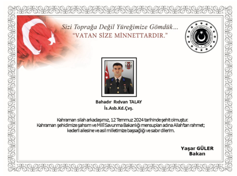 Irak'ın kuzeyindeki Pençe-Kilit Operasyonu sırasında meydana gelen patlama sonucu İstihkam Astsubay Kıdemli Çavuş Bahadır Rıdvan Talay şehit düştü.