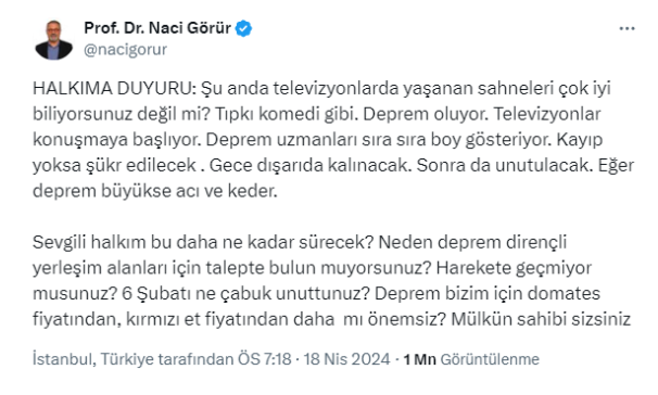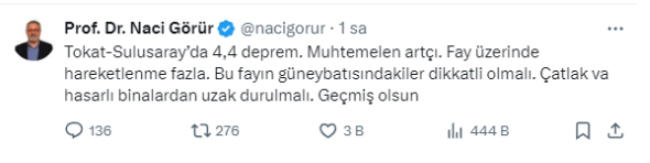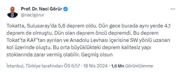 Prof. Dr. Naci Görür, Tokat'ta meydana gelen 5,6 büyüklüğündeki deprem sonrası açıklama yaptı. Görür, ''Daha önce yazdığım gibi, KAF'ın Tokat'tan ayrılıp Anadolu Levhası içerisine SW yönünde uzanan bir kolu üzerinde. Bu deprem kalitesiz yapı stokunda ve yeraltı yapılarında yıkıcı olabilir'' dedi.Tokat'ta meydana gelen 5,6 büyüklüğündeki deprem ve sonrasındaki artçı sarsıntılarla ilgili Prof. Dr. Naci Görür, açıklamalarda bulundu. 4,4'lük artçı depremin ardından Görür, "Fay üzerinde hareketlenme fazla. Bu fayın güneybatısındakiler dikkatli olmalı. Çatlak va hasarlı binalardan uzak durulmalı. Geçmiş olsun" dedi.Görür, açıklamalarında şu ifadelere yer verdi: "Tokat Sulusaray'da 5,6 büyüklüğünde deprem oldu. Aynı yerde dün gece 4.1 bir deprem daha olmuştu. İlk deprem öncü depremdi. Şimdi olan deprem orta büyüklüğe yakın. Daha önce yazdığım gibi, KAF'ın Tokat'tan ayrılıp Anadolu Levhası içerisine SW yönünde uzanan bir kolu üzerinde. Bu deprem kalitesiz yapı stokunda ve yeraltı yapılarında yıkıcı olabilir. Geçmiş olsun" ifadelerini kullandı.Bir diğer paylaşımında ise Naci Görür, şunları söyledi: "Şu anda televizyonlarda yaşanan sahneleri çok iyi biliyorsunuz değil mi? Tıpkı komedi gibi. Deprem oluyor. Televizyonlar konuşmaya başlıyor. Deprem uzmanları sıra sıra boy gösteriyor. Kayıp yoksa şükr edilecek . Gece dışarıda kalınacak. Sonra da unutulacak. Eğer deprem büyükse acı ve keder.Sevgili halkım bu daha ne kadar sürecek?Neden deprem dirençli yerleşim alanları için talepte bulun muyorsunuz? Harekete geçmiyor musunuz? 6 Şubatı ne çabuk unuttunuz?Deprem bizim için domates fiyatından, kırmızı et fiyatından dahamı önemsiz? Mülkün sahibi sizsiniz"Sulusaray merkezli 5,6 büyüklüğündeki deprem Tokat'ın yanı sıra Sivas, Yozgat, Çorum, Çankırı, Kırşehir, Kayseri, Amasya, Samsun ve Ordu'da da hissedildi.Sulusaray merkezli 5,6'lık depremin ardından yine aynı bölgede saat 22.31'de 4,4, saat 21.43'te 4, saat 18.31'de ise 3,5 büyüklüğünde üç deprem daha meydana geldi.
