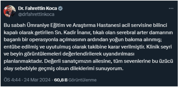Sağlık Bakanı Fahrettin Koca, evinde inme geçiren ve hastaneye kaldırılan usta oyuncu Kadir İnanır'ın sağlık durumuyla ilgili açıklama yaptı. Bakan Koca, Kadir İnanır'ın tıkalı damarının başarılı bir ameliyatla açıldığını ve şu an yoğun bakımda olduğunu bildirerek, "Klinik seyri ve beyin görüntülemeleri değerlendirilerek uyandırılması planlanmaktadır." ifadelerini kullandı.Sabah saatlerinde evinde rahatsızlanan ve inme geçirmesi nedeniyle bilinci kapalı olarak hastaneye kaldırılan sanatçı Kadir İnanır'ın sağlık durumuyla ilgili Sağlık Bakanı Fahrettin Koca'dan açıklama geldi. Bakan Koca, ameliyat edilen Kadir İnanır'ın klinik seyri ve beyin görüntülemeleri değerlendirilerek uyandırılmasının planlandığını ifade etti.Kadir İnanır, bu sabah İstanbul Beykoz'daki evinde inme geçirdi. 74 yaşındaki İnanır'ın bilinci kapalı şekilde Ümraniye Eğitim Araştırma Hastanesi'ne sevk edildiği belirtildi.Bakan Koca ise Kadir İnanır'ın sağlık durumuna ilişkin açıklama yaptı.Sağlık Bakanı Koca'dan Kadir İnanır'ın durumuyla ilgili ilk açıklama: Uyandırılması planlanıyorBakan Koca, X'teki sosyal medya hesabından yaptığı paylaşımda, "Bu sabah Ümraniye Eğitim ve Araştırma Hastanesi acil servisine bilinci kapalı olarak getirilen Sn. Kadir İnanır, tıkalı olan serebral arter damarının başarılı bir operasyonla açılmasının ardından yoğun bakıma alınmış; entübe edilmiş ve uyutulmuş olarak takibine karar verilmiştir. Klinik seyri ve beyin görüntülemeleri değerlendirilerek uyandırılması planlanmaktadır. Değerli sanatçımızın ailesine, tüm sevenlerine bu üzücü olay sebebiyle geçmiş olsun dileklerimi sunuyorum." dedi.Sağlık Bakanı Koca'dan Kadir İnanır'ın durumuyla ilgili ilk açıklama: Uyandırılması planlanıyorKadir İnanır'ın yeğeni Levent İnanır ise, sabah saatlerinde konuyla ilgili yaptığı açıklamada "Tıp tabiriyle emboli yani pıhtı atması oldu beyinde. Operasyonda doktorlar. Zamanında müdahale ettiler sağ olsunlar. Hayati tehlikesi kesinlikle yok zaten.Belki araz kalabilir dediler ama erken müdahale olduğu için. İyi olacak diye düşünüyoruz.