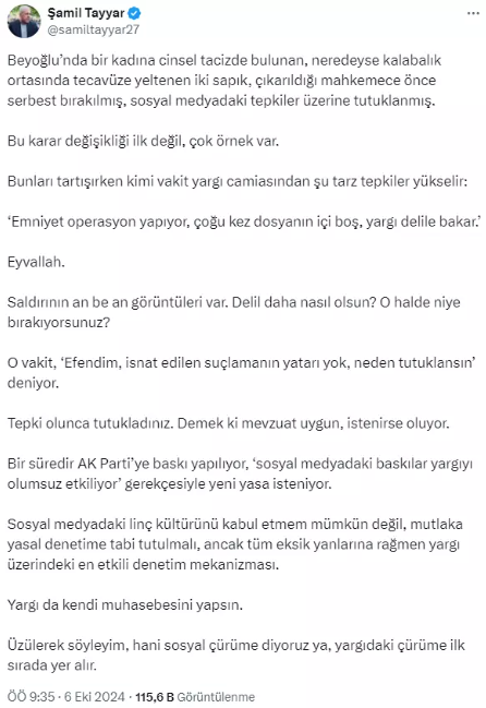 Eski AK Parti Milletvekili Şamil Tayyar, İstanbul Beyoğlu'nda genç bir kadına yönelik tecavüz girişimi sonrası yaşanan yargı sürecini hedef aldı.
