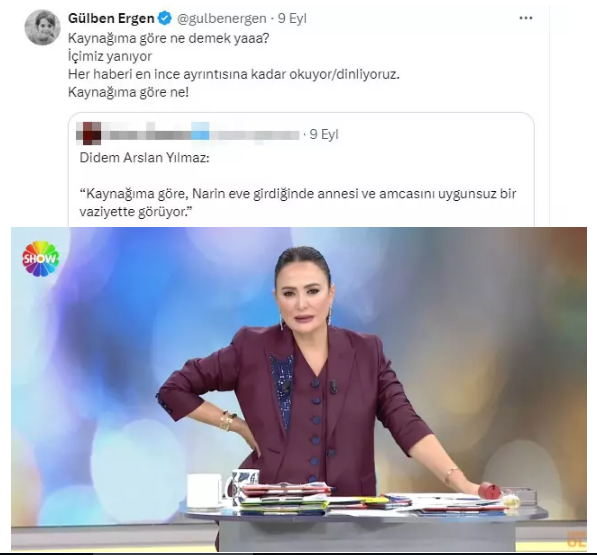 Diyarbakır'da kaybolan 8 yaşındaki Narin Güran'ın ölümünün ardından yaşanan gelişmeler, medyada büyük yankı uyandırmıştı.Narin Güran'ın kaybolduğu 19. günün ardından ölü bulunması, medya ve sosyal medyada geniş bir şekilde ele alındı.Bu kapsamda Show TV'de yayınlanan programında Narin'in durumu hakkında dikkat çekici açıklamalarda bulunan Didem Arslan Yılmaz, açıklamalarıyla gündeme oturmuştu.Yılmaz, programında Narin Güran'ın "kaynağına göre anne ve amcasını uygunsuz bir vaziyette gördüğünü" belirten bilgiler sundu.Bu açıklama, ünlü şarkıcı Gülben Ergen'in tepkisini çekti. Ergen, sosyal medyada "Kaynağıma göre ne demek ya?İçimiz yanıyor. Her haberi en ince ayrıntısına kadar okuyoruz. Kaynağıma göre ne?" şeklinde eleştiride bulundu.Gülben Ergen'in bu çıkışına Didem Arslan Yılmaz'dan sert bir yanıt geldi. Yılmaz, canlı yayında Ergen'in eleştirilerine karşılık vererek, "Sana öğretecek kadar değmezsin!" ifadelerini kullandı.Yılmaz, Ergen'in "kaynağıma göre ne demek" şeklindeki eleştirisine şu sözlerle tepki gösterdi: "Haber kaynağı ne diye soranlar, bir de bunu sosyal medyada paylaşıyorlar. Ne diyeyim ya...Onlar söyleyebiliyorsa, becerebiliyorsa şarkı söylemeye çalışsınlar. Sen önce bir şarkı söylemeye çalış. Bir gazeteciye kaynağını sorma hadsizliğinde bulunamazsın.Kimsin sen ya? Günlerdir tweet atıp bu olaydan nemalanmaya çalışıyorsun.Yazıklar olsun sana. İnsanların işini yapmasını engelliyorsun. Sana oturup öğretecek kadar değmezsin."Didem Arslan Yılmaz'ın bu sert yanıtı, medyada geniş bir yankı uyandırarak, iki ünlü ismin arasındaki gerginliği gözler önüne serdi.Bu olay, medyada ve sosyal medyada geniş bir şekilde tartışılmaya devam ediyor.
