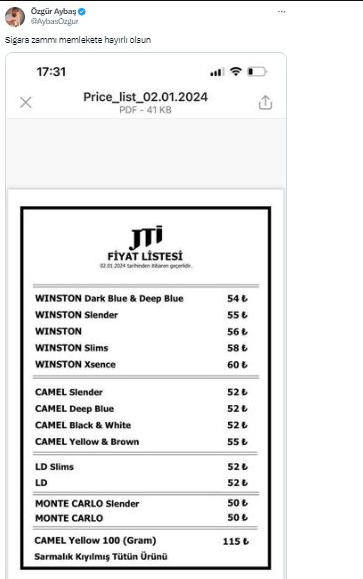 Yeni yıla girilmesiyle birlikte sigara tiryakileri, sigara fiyatlarındaki olası zammı araştırmaya başladı.Gelecek zamların ardından en ucuz sigara kaç lira olacak? İşte ayrıntılar...2023 yılında sigaraya yapılan 23 liralık zamların ardından, 2024'ün ilk günlerinde yeni bir zam habercisi olarak sigara zamları gündeme geldi.Özellikle zamlanan ÖTV oranının etkisiyle, 1 Ocak itibarıyla sigara fiyatlarına yeni bir zam bekleniyor.Sigara ve alkole belirlenen ÖTV tutarı, yasa gereği her 6 ayda bir Üretici Fiyat Endeksi (ÜFE) kadar arttırılıyor.Temmuz ayından bu yana %14'lük bir artış gösteren ÜFE'nin yılın son altı ayını en az %16'lık artışla tamamlaması bekleniyor.KDV oranındaki %2'lik artışın ardından 5 TL zam uygulanan sigara fiyatlarının, yeni yılda 50 liranın üzerine çıkması öngörülüyor.Yeni düzenlemeyle birlikte, 1 Ocak 2024 tarihinden itibaren sigara fiyatlarında vergi değişikliği yapılması ve asgari maktu verginin 1,1114 TL'den 1,4249 TL'ye çıkarılması bekleniyor.Bu da sigara fiyatlarına zam olarak yansıyabilecek.Son zamlarla birlikte birçok markanın en ucuz sigarasının fiyatı 45 TL'ye kadar çıkarken, yeni yılda sigara fiyatlarına 2 ila 5 TL arasında bir zam yapılması bekleniyor.Böylece en ucuz sigara fiyatı 50 TL'yi bulabilir.JTI GRUBUNA ZAM GELDİTürkiye Tekel Bayileri Platformu Başkanı Özgür Aybaş, X hesabından yaptığı paylaşımda JTİ grubu sigaralarına zam geldiğini duyurdu.Zamlı listeyi paylaşan Aybaş, "Sigara zammı memlekete hayırlı olsun" ifadelerini kullandı.Aybaş'ın paylaşımı şöyle: