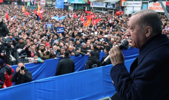 Bu 40 bin ile 31 Mart'a yürüyoruz." ifadelerini kullandı.Cumhurbaşkanı Erdoğan, her safhasını milletle birlikte verdikleri mücadelenin en yakın şahitlerinden birinin Ağrı olduğunu belirterek, şöyle konuştu:"Şimdi yine birileri çıkmış, tek parti faşizmini hortlatmak için can atan CHP ile bir olup sizlerin iradesine ipotek koymaya çalışıyor.Dün silah zoruyla yaptıklarını bugün örtülü baskıyla, daha önemlisi tek parti faşistleriyle gizli saklı ittifaklar kurarak gerçekleştirmenin gayreti içindeler. Öyle ki bu uğurda yasakların, hukuksuzlukların ve baskıların sembolü olan CHP'ye bile yedek tekerlek yapacak duruma düştüler. Ne dünya eski dünya ne Türkiye eski Türkiye. Artık demokrasisiyle, yönetim biçimiyle, eğitimden sağlığa tüm kalkınma altyapısıyla yepyeni bir Türkiye var. Dün Ağrı Ankara'ya, İstanbul'a, Antalya'ya çok uzaktı, dünyaya da çok uzaktı. Bugün ise Türkiye'nin ve dünyanın her yeri Ağrılı kardeşlerim için gelişen iletişim ve ulaşım teknolojilerini emirlerine sunmamız sayesinde adeta bir adım, bir tık mesafede.