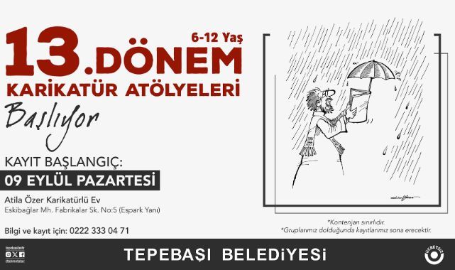 Tepebaşı Belediyesi tarafından düzenlenen 13. Dönem Karikatür Atölyeleri'nin kayıt dönemi 9 Eylül 2024 itibarıyla başlıyor.