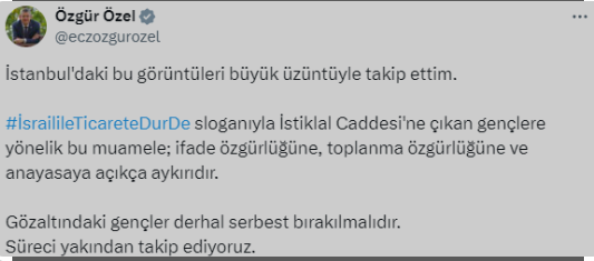 İstiklal Caddesi'nde İsrail ile ticareti protesto etmek üzere toplanan gruba polis müdahale etti. Onlarca kişi sert müdahale ile gözaltına alırken, bazı kişilere ise ters kelepçe uygulandığı görüldü.CHP lideri Özel, görüntülere ilişkin "İstanbul'daki bu görüntüleri büyük üzüntüyle takip ettim. İstiklal Caddesi'ne çıkan gençlere yönelik bu muamele; ifade özgürlüğüne, toplanma özgürlüğüne ve anayasaya açıkça aykırıdır. Gözaltındaki gençler derhal serbest bırakılmalıdır" dedi.İstanbul Taksim Meydanı'nda Türkiye ve İsrail arasındaki ticaretin durdurulması için protesto düzenleyen eylemcilere polis müdahale etti. Protestocuların etrafını çembere alan polis, göstericilerin bazılarını ters kelepçeyle gözaltına aldı.CHP Genel Başkanı Özgür Özel, o anlara ilişkin görüntüleri sosyal medya hesabından paylaşarak gözaltına alınan gençlerin derhal serbest bırakılması gerektiğini ifade etti.Beyoğlu'nda İsrail'le ticareti protesto edenlere ters kelepçe gözaltı! Özgür Özel'den görüntülere sert tepkiİsrail ile ticaretin kesilmesi için eylem yapan protestocular, "İsrail'le ticareti kes dedik, katliama ortak olmak dedik. 7 Ekim'den beri İsrail'le milyar dolarlar hacminde ticaret yapıldı. İsrail'e çelik, beton Türkiye'den gidiyor" sözleriyle yapılan ticaretin sonlandırılması gerektiğini ifade etti.Ancak protestocuların etrafını bir anda çevik kuvvet polisleri çevreledi. Birçok kişi ters kelepçe gözaltına alınarak polis aracına bindirildi.CHP Genel Başkanı Özgür Özel, gözaltına alınan gençlere sahip çıkarak görüntülere tepki gösterdi. Özel şunları söyledi: "İstanbul'daki bu görüntüleri büyük üzüntüyle takip ettim.'İsrailile Ticarete Dur De' sloganıyla İstiklal Caddesi'ne çıkan gençlere yönelik bu muamele; ifade özgürlüğüne, toplanma özgürlüğüne ve anayasaya açıkça aykırıdır. Gözaltındaki gençler derhal serbest bırakılmalıdır. Süreci yakından takip ediyoruz."
