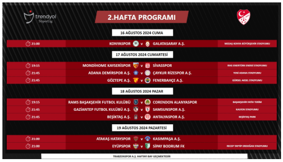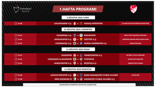 2024-2025 sezonunun açılış maçı, geçtiğimiz sezonun şampiyonu Galatasaray’ın ev sahipliğinde gerçekleştirilecek. Sezonun ilk karşılaşması, Türk Telekom Stadyumu’nda oynanacak ve futbolseverler bu heyecanlı mücadelenin başlamasını dört gözle bekliyor.İlk haftanın programının yanı sıra, sezonun 2. haftasında da önemli bir karşılaşma yer alıyor. 16 Ağustos Cuma günü saat 21:00’de Konyaspor ile Galatasaray karşı karşıya gelecek. Bu maç da, futbolseverler tarafından dikkatle takip edilecek.Program Özeti