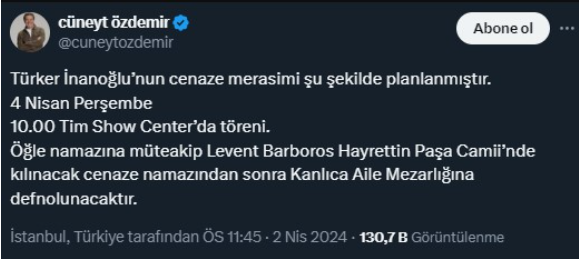 1974 yılında yapımcı Türker İnanoğlu ile nikah masasına oturan Gülşen Bubikoğlu, eşinin vefatının ardından yaptığı paylaşımda "Çok kıymetli eşim Türker İnanoğlu'nu kaybetmenin derin üzüntüsü içerisindeyim" ifadelerini kullandı.Türker İnanoğlu'nun kaybının ardından eski ve yeni eşinden veda mesajları geldiÜnlü yönetmenin vefat haberini sosyal medya hesabından duyuran Sağlık Bakanı Fahrettin Koca, yaptığı paylaşımda, "Sanat dünyamızın ünlü isimlerinden yapımcı ve film yönetmeni Türker İnanoğlu geçirdiği ani rahatsızlığın ardından kaldırıldığı hastanede yapılan müdahalelere rağmen kurtarılamayarak hayatını kaybetti. Kendisine Allah'tan rahmet, yakınlarına başsağlığı diliyorum. Sevenleri olarak acımız büyük." ifadelerini kullandı.Türker İnanoğlu'nun kaybının ardından eski ve yeni eşinden veda mesajları geldiİnanoğlu'nun damadı gazeteci Cüneyt Özdemir, sosyal medya hesabından kayınpederinin cenaze programını paylaşarak, "Türker İnanoğlu'nun cenaze merasimi şu şekilde planlanmıştır.4 Nisan Perşembe, 10.00 Tim Show Center'da töreni. Öğle namazına müteakip Levent Barboros Hayrettin Paşa Camii'nde kılınacak cenaze namazından sonra Kanlıca Aile Mezarlığı'na defnolunacaktır" dedi.