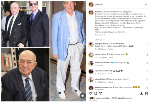 Türker İnanoğlu'nun 88 yaşında hayatını kaybetmesinin ardından eski eşi Filiz Akın ve 50 yıllık eşi Gülşen Bubikoğlu veda mesajları yayınladı. Akın mesajında "Son çınarı, oğlumun babasını kaybettik" derken Bubikoğlu da "Kıymetli eşimi kaybetmenin derin üzüntüsü içindeyim" dedi.Türk sinemasının 'Bay Sinema'sı olarak nam salan ünlü yönetmen ve yapımcı Türker İnanoğlu, rahatsızlığı nedeniyle kaldırıldığı hastanede 87 yaşında hayatını kaybetti.İnanoğlu'nun vefatının ardından eski eşi Filiz Akın ve 50 yıllık hayat arkadaşı Gülşen Bubikoğlu'ndan paylaşımlar gecikmedi.AKIN: Filiz Akın, 1964 ile 1974 yılları arasında evli kaldığı ve İlker İnanoğlu adını verdikleri bir oğlu olan Türker İnanoğlu'nun kaybının ardından yaptığı paylaşımda "Uzun süredir hastalıklarla uğraşıyordu. Doktorları ve ailesinin bütün gayretine rağmen kurtarılamamış… Hayatında pek çok şeyden de fazla sinemayı seven, gerçekten de son günlerine kadar üreten, önce yönetmen ve yapımcı daha sonra sadece prodüktör olarak devam eden son çınarı, oğlumun babasını kaybettik! Başta eşinin, çocukları Zeynep ve İlker'in, torunlarının ve tüm sinema camiasının başı sağ olsun, sabırlar diliyorum… "Bay Sinema" maalesef yok artık…" dedi.Türker İnanoğlu'nun kaybının ardından eski ve yeni eşinden veda mesajları geldi