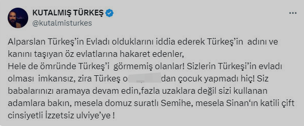 Adana Ülkü Ocakları'nın İYİ Parti'nin Adana adayı Ayyüce Türkeş'i ihanetle suçlamasından sonra Alparslan Türkeş'in oğlu Kutalmış Türkeş'ten sert tepki geldi. Türkeş'in "Sizlerin Türkeş'in evladı olması imkansız, zira Türkeş o.. çocuk yapmadı hiç! Babalarınızı aramaya devam edin" sözlerine Ülkü Ocakları ve MHP yöneticilerinden de aynı sertlikte yanıtlar geldi.MHP Genel Başkan Yardımcısı İzzet Ulvi Yönter, Türkeş için "Şizofren ahlaksız" ifadesini kullandı.Adana Ülkü Ocakları'nın İYİ Parti'nin Adana Büyükşehir Belediye Başkan adayı Ayyüce Türkeş'i, "Adana'da ihanete geçit yok." pankartıyla hedef almasının ardından Alparslan Türkeş'in oğlu Kutalmış Türkeş'ten sert tepki geldi.MHP Genel Başkan Yardımcıları Semih Yalçın ve İzzet Ulvi Yönter'i hedef alan Türkeş, "Sizlerin Türkeş'in evladı olması imkansız, zira Türkeş o.. çocuk yapmadı hiç!Babalarınızı aramaya devam edin, fazla uzaklara değil sizi kullanan adamlara bakın, mesela domuz suratlı Semihe, mesela Sinan'ın katili çift cinsiyetli İzzetsiz Ulviye'ye" ifadelerini kullandı.Adana Ülkü Ocakları, İYİ Parti'nin Adana Büyükşehir Belediye Başkan adayı olan Ayyüce Türkeş'i ihanetle suçlamıştı. Ayyüce Türkeş'in "Adana'nın hakkı daha fazlası" yazılı pankartının hemen yanına asılan pankartta "Adana'da ihanete geçit yok. Dalından kopan yaprağın akıbetini rüzgar tayin eder!" sözleri yer almıştı.MHP'nin kurucu genel başkanı Alparslan Türkeş'in oğlu Kutalmış Türkeş, Adana Ülkü Ocakları'na MHP Genel Başkan Yardımcıları Semih Yalçın ve İzzet Ulvi Yönter'i hedef alarak tepki gösterdi. Twwiter'dan paylaşım yapan Kutalmış Türkeş zehir zemberek ifadeler kullandı.Türkeş paylaşımında şunları söyledi: "Alparslan Türkeş'in evladı olduklarını iddia ederek Türkeş'in adını ve kanını taşıyan öz evlatlarına hakaret edenler, Hele de ömründe Türkeş'i görmemiş olanlar!Sizlerin Türkeş'in evladı olması imkansız, zira Türkeş o...... çocuk yapmadı hiç! Siz babalarınızı aramaya devam edin, fazla uzaklara değil sizi kullanan adamlara bakın, mesela domuz suratlı Semihe, mesela Sinan'ın katili çift cinsiyetli İzzetsiz ulviye'ye!"Kutalmış Türkeş'in hakaretine MHP ve Ülkü Ocakları yöneticilerinden yanıt gecikmedi. Adı Sinan Ateş suikastı dosyasına da giren Ülkü Ocakları Genel Başkanı Ahmet Yiğit Yıldırım, Türkeş'e sosyal medya hesabından yanıt verdi: "Ahmet Kutalmış (@kutalmisturkes) denilen rezil, ahlaksız herif!..Başbuğumuzu görmediği halde gönülden seven, davasını ve ülküsünü yaşatmak için mücadele eden Ülküdaşlarımıza küfür edecek kadar aşağılıksın! Hayatın Başbuğumuzun emanetlerine hıyanet etmekle, kemiklerini sızlatmakla geçti.Başbuğumuzun soyadının arkasına sığınarak milyonlarca Ülkücünün mukaddes davasına, kutsal Ocağına ihanet ettin! Kuduz köpekten farkın yok! Haddini bil salyalarını Parti ve Ocağımızdan öteye akıt. Dikkat et; kuduz köpeklerin sonunu herkes bilir..! Biz uyaralım da…"Kutalmış Türkeş'in hedef aldığı MHP Genel Başkan Yardımcısı İzzet Ulvi Yönter de "Şizofren ahlaksız, feyk hesaplardan ettiğin ağır küfürler, doğrudan attığın iftiralar elbette utanmaz yüzüne yapışıp kalacak!İnsanlıktan çıkmışsın, ne kullanıyorsan ara vermeni tavsiye ederim, itimat etmiyorsan iğrenç yüzüne bakabilirsin…Elbette bu hakaretlerinden ve müfteriliğinden dolayı hukukta hesap vereceksin…" ifadelerini kullandı.MHP Kayseri Milletvekili Baki Ersoy ise Kutalmış Türkeş'e şu yanıtı verdi: "Bu ahlaksız dilin, bu şekilde mikrop saçması iradesini kaybetmiş haplanmış bir halin yansımasıdır. Başbuğ Türkeş Türk gençliğine 'Hepiniz birer Türk Bayrağı'sınız.Bayrağı lekelemeyin, kirletmeyin yere düşürmeyin.' Çağrısında bulunurken, bu haplanmış dilin sahibi her türlü lekenin bizzat üreticisi durumundadır.Bu dil psikolojik tedaviye, ahlaki bir terbiyeye ihtiyaç duymaktadır . Bu dilin sahibi Başbuğ Türkeş'in evladı olamaz. Olsa olsa onun miras bıraktığı Ülkücü ahlaka ihanet eden hain evlat olur. Başbuğumuzun mirası ahlakla, edeple, adapla yaşatılır."