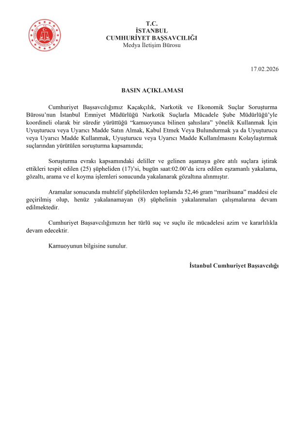 Operasyonla ilgili İstanbul Cumhuriyet Başsavcılığı tarafından yapılan açıklamada, Kaçakçılık, Narkotik ve Ekonomik Suçlar Soruşturma Bürosu’nun, İstanbul Emniyet Müdürlüğü Narkotik Suçlarla Mücadele Şube Müdürlüğü ile koordineli şekilde bir süredir kamuoyunda bilinen kişilere yönelik soruşturma yürüttüğü bildirildi.