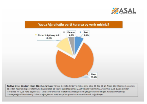 İYİ Parti'den istifa edip yeni parti kurma hazırlıklarına başlayan yavuz ağıralioğlu hakkında yapılan ankette çarpıcı sonuçlar ortaya çıktı.Vatandaşlara yöneltilen "Yavuz Ağıralioğlu parti kurarsa oy verir misiniz?" sorusuna yüzde 75.3'lük kesim "Hayır" yanıtı verdi.Ankette, Ağıralioğlu'na parti kurması halinde oy vereceğini belirtenlerin oranı ise yüzde 7.8 olarak gerçekleşti.Bu sonuçlar, Ağıralioğlu'nun yeni parti kurma sürecinde karşılaşabileceği zorlukları gösteriyor.