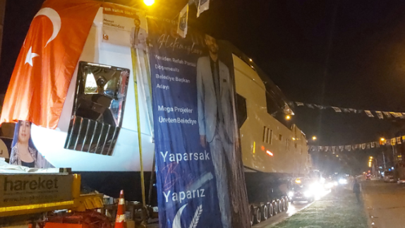 Konvoyun en önünde giden yatın yüklü olduğu kamyonu ise parti ve Hekimoğlu'nun fotoğraflarının yer aldığı seçim otobüsleri ve parti üyelerinin araçları takip etti. Konvoy, ilçe merkezinden mehter marşı eşliğinde geçti. Konvoyun geçişi sırasında vatandaşlar cep telefonları ile bu anları görüntüledi.