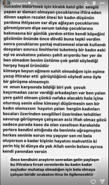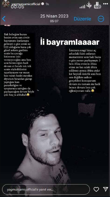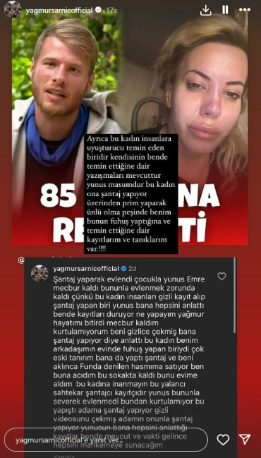 Bu zamana kadar sustum, ses etmedim ama masum bir adamın bu denli yalancı, şantajcı bir kadın yüzünden mağdur edilmesine artık yüreğim dayanmadığı için bunları açıklamak istedim. Biraz daha beni zorlarsa kayıtları paylaşacağım."Yağmur Sarnıç'tan Yunus Emre'nin eşine olay suçlamalar: Uyuşturucu madde satıp fuhuş ticareti yapıyorBeria denilen Diyarbakırlı namus abidesi olarak kendini kamuoyuna tanıtan, Hristiyan'ım diye gezen ama sıkışınca Allah kitap diyen bu dinsiz ve mağduru oynayan bu dilber beni şuan WhatsApp üzerinden arayarak sesli ve yazılı tehdit ederek beni susturabileceğini sanıyor. Paylaşımı silmemi istiyor sizce bende geri vites var mı? Benim Allah'tan başka kimseden korkum yok.Ben belge ve kayıt olmadan asla konuşmam kimseye de iftira atmam. Bu Beria, Yunus'a kız ayarlayıp birlikte grup yapıyorlardı yani zaten kendisi kocam kocam dediği adama karı ayarlayan ve birlikte grup yapan bir p....enk ve uyuşturucu satıcısıdır.Bende her şey kayıtlı, halk senin ne b.k olduğunu görecek senin maskeni düşüreceğim çok yanlış kişiye çattın sen."Yağmur Sarnıç'tan Yunus Emre'nin eşine olay suçlamalar: Uyuşturucu madde satıp fuhuş ticareti yapıyorDaha sonra Yunus Emre'nin 25 Nisan 2023 tarihinde evinde yarı çıplak verdiği pozu yayınlayan Sarnıç, "Bak bebeğim burası benim evim. Sarı civciv bayramımı kutlamaya gelmişti. O gün sen ne b.. olduğunu bana çok güzel anlattı garibim. Bu çocuğu bitirmene izin vermeyeceğim ama ben seni bitireceğim. Hadi devam et ben de tek tek senin söylediklerini ispatlayayım. Var mısın, ben varım hodri meydan. İstersen fotoğrafın rengi biraz aç arkadaki kim anlarsın" dedi.Yağmur Sarnıç'tan Yunus Emre'nin eşine olay suçlamalar: Uyuşturucu madde satıp fuhuş ticareti yapıyorYağmur Sarnıç'ın paylaşımlarına cevap veren Beria Özden ise şu ifadeleri kullandı: "İftira edenin hiç bir yerde yeri yoktur. Ortalık karıştırıp prim yapmaya çalışan kişi ile isteğiniz üzere uğraşacağım çünkü herkesi mağdur edip edip tehditler edip artık kenara çekilemeyecek.Bir gün öyle birine denk gelir ki sonuçları kötü olur. Bir biz kalmıştık her gün birine sallayan biri ve hakkımdaki haberleri zaten her şeyi açıklıyor.Kocasını öldürtmek için kiralık katil gibi sevgili yapan, ar damarı olmayan, çocuklarına iftira eden döven sapkın rezalet ötesi bir kadın düşünün. Yardıma ihtiyacım var diye ağlayan çocuklarımı göremiyorum diye serum takılıp çocuklarına bakmasına bir günlük yardım ettim kendi köpeğini gözümün önünde önce dövdü buna tepki verdim sonra çocuklarını şantaj malzemesi olarak kullandı.Dosyaları sınırsız limitlerini tüketmiş bir kadın eski eşi ve avukatına yalancı şahit arıyordu her yerde ben olmadım benim üstüme çok geldi. Söylediği her şey hayal ürünüdür kimseye boyun eğmem."Yağmur Sarnıç'tan Yunus Emre'nin eşine olay suçlamalar: Uyuşturucu madde satıp fuhuş ticareti yapıyorŞahit olmadığım için eşime yazıp iftiralar etti görüştüğünü söyledi ama öyle bir görüşme olmamıştı ve onun karşısında bildiği biri yok. Çocuk kaçırmadan zarar verdiği arkadaşları var ben yalan yere şahit olmam çünkü nafaka alacaktı hala içine oturmuş. Senin eline kimseyi düşürmesin sen bir kadın olamazsın hayatın yalan her gün kadınları kocaları üzerinden sevgilileri üzerinden tehditler savurup görüşmeye çalışan aciz iflah olmaz gözü sadece parada kaos da olan zavallısın.Karakolda yerlere kendini attığında da benimle uğraşmıştın herkes seninle sorun mu yaşıyor sen mi bela oluyorsun. O kadar kişinin hayatını mahvettin ki yerin hiçbir dünya da yok. Allah senin belanı ayrıca kendi yanından versin. Önce kendisini araştırın sonradan gelin paylaşın. Bu iftiralara fırsat verenlerde bu kadın kadar suçludur. Muhatap olmadığım için bela olmaya çalışan biridir avukatım itina ile ilgilenecektir."